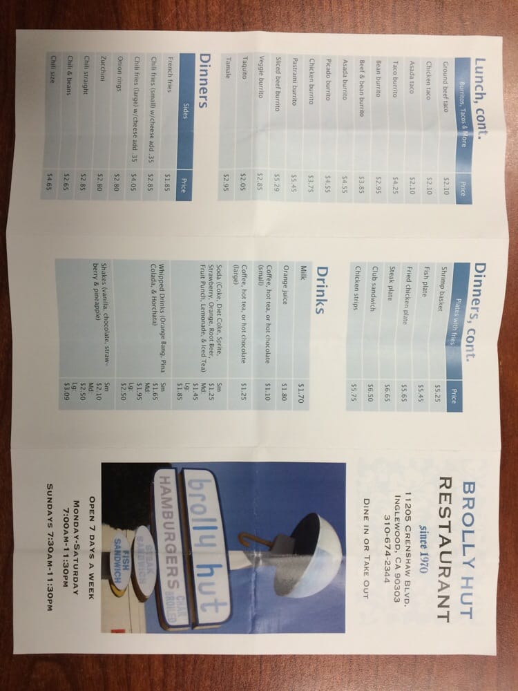Brolly Hut is a casual dining spot in Inglewood, CA, offering a variety of burgers and other American favorites. They provide takeout, delivery, and even cater to vegetarian options. Customers rave about the pastrami burger with grilled onions and the bacon cheeseburger. The thousand island dressing and ranch dressing receive high praise as well. With options for breakfast, lunch, and dinner, Brolly Hut is a great choice for any meal of the day. The atmosphere is welcoming for groups and families, with outdoor seating available. The addition of Wi-Fi, happy hour specials, and waiter service make this a versatile dining experience. Don't forget to try their zucchini fries and other sides for a complete meal. Make sure to check out Brolly Hut for a delicious and satisfying dining experience.